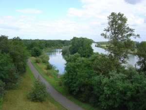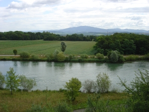Bei der Abfahrt in Basel hatte ich noch keine Ahnung, was das Etappenziel sein würde. Bereits zuhause hatte ich mir das Radtourenbuch Rhein-Radweg, Teil 1 von Basel nach Mainz gekauft und mich anhand der Beschreibungen entschieden, den Rhein auf der französischen Seite anzugehen. Nach dem exzellenten Kartenmaterial zu urteilen folgt der Radweg in Frankreich zwar selten dem Rhein (manchmal entfernt man sich mehr als zehn Kilometer vom Fluss), doch ist er durchgehend asphaltiert. Ganz anders sieht es auf der deutschen Seite aus: Alles Kiesweg. Die rund zehn Kilometer Kiesweg der Etappe am Vortag hatten mir gezeigt, dass ich mir das auf keinen Fall antun möchte. Später habe ich von anderen Radfahrern, die ich unterwegs getroffen habe, erfahren, dass diese Entscheidung sicher richtig war, denn zusätzlich sei auf der deutschen Seite auch die Signalisation mangelhaft. Doch dazu später noch mehr... Von der Jugendherberge in Basel führt der Weg zuerst quer durch die Altstadt. Der Marktplatz direkt beim Rathaus ist dabei nur eines der architektonischen Highlights. Das ändert sich aber schnell: Beim schweizerisch-französischen Zoll an der Hüningerstrasse wird man zwar nicht kontrolliert, doch fährt man mitten durch die Anlagen der Basler Gross-Chemie. Alle Firmennamen sind wohlbekannt, die Luft riecht sicherlich nicht nach Blumen. Das ist aber schnell vorbei, denn in Huningue zweigt der Radweg von der grossen Strasse ab und folgt dem Canal de Huningue. Eines ist sofort klar: Wenn die ganze Strecke so schön ist, wie hier, dann wird dieses "Abenteuer" ein grosser Genuss werden. Dem Kanal folgt man bis nach Niffer, wo er bei einer Schleuse von Le Corbusier einerseits in den Rhein fliesst, andererseits als Canal du Rhône au Rhin (Rhein-Rhône-Kanal) durch den Hardt-Wald fliesst. Diesem Kanal folgt man, später geht es direkt in den Wald, wo man höchstens noch Hasen trifft. Nach der Durchquerung dieses riesigen elsässischen Waldes gönne ich mir in Blodelsheim eine Pause und ein Mittagessen aus den Packtaschen. Ab hier folgt der Radweg grösseren Strassen bis nach Neuf-Brisach, wo die erste Etappe des Radtourenbuchs endet. Am Nachmittag fahre ich weiter nach Norden, teilweise entlang der offiziellen Radroute, teilweise nehme ich kleinere Abkürzungen, denn wenn man schon auf Strassen fahren muss, dann muss ich nicht noch einen Umweg machen. Bereits am Morgen hatte ich auf den Karten nach Zeltplätzen in dieser Gegend gesucht und mir ein paar Kandidaten gemerkt. Viele gibt es nicht, doch scheine ich mit dem in Boofzheim Glück zu haben. Direkt vor dem grossen Zeltplatz hat es ein Einkaufzentrum, wo ich mich mit Esswaren für den Abend und die nächsten zwei Tage eindecken kann. Ich kaufe mir auch mehr Getränke, denn unterwegs habe ich merken müssen, dass es in Frankreich schwieriger ist als in der Schweiz, zu Trinkwasser zu kommen. Den Abend verbringe ich auf dem Zeltplatz mit einer Pizza, einem Halbliter Muscat und ein paar Sudokus. Das ist die ehrlich verdiente Entspannung! In der Nacht ändert dann leider das Wetter und das Zelt wir (aussen) total nass. Eines ist jetzt klar: Auch die nächste Nacht muss ich wieder im Zelt nächtigen, denn ich muss aufstellen können, damit es trocknen kann.