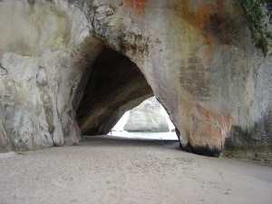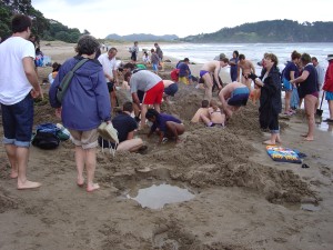 Ein ganz spezielles Phänomen ist die sogenannte Hot Water Beach. Hier kann man sich entweder mit einer Schaufel oder mit blossen Händen ein kleines Loch am Strand budeln und baut sich damit ein Heisswasser-Bad. Das ist möglich, weil sich unter einem sehr kleinen Abschnitt dieses Strandes (ca. 10 Meter) eine heisse Quelle befindet. Dies ist eines der vielen vulkanischen Überbleibsel, die man in Neuseeland findet. Erstaunlicherweise muss man sich noch nicht einmal ein Loch budeln, es genügt, wenn man die Füsse in den Sand hineindrückt. Unglaublich daran ist, dass man schon nach wenigen Zentimetern auf so heisses Wasser stösst, dass man aufpassen muss, die Füsse nicht zu verbrennen. |