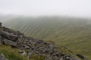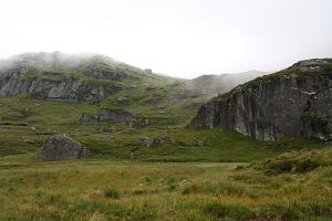 After some time there is a crossing. The trail eighter crosses the creek to the left and climbs very fast afterward, or goes on into the valley. We took the left option because there were other people in front of us taking that trail, too. It follows the creek and finally disappears in that one. You have to climb from rock to rock and even use your hands sometimes. After some time we had reached the top but could hardly see five meters. And it was raining.