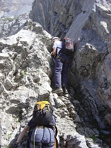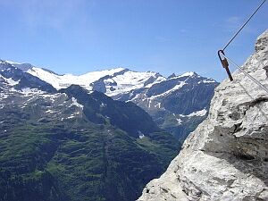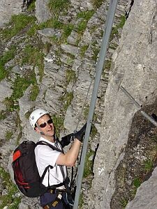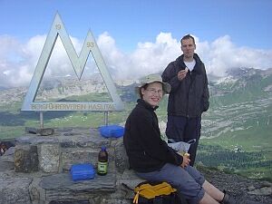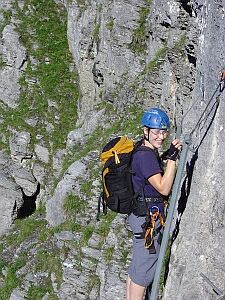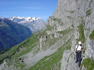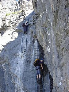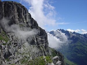 Idealer Startort für die Begehung des Tälli-Klettersteigs ist die SAC Tälli-Hütte oberhalb Gadmen respektive Furen (Landeskarte 1:25'000, Blatt 1210 "Innertkirchen"). Das Postauto fährt von Göschenen über den Sustenpass oder von Meiringen an diese beiden Ausgangsorte. Wir haben den Aufstieg von Gadmen (1205müM) gewählt. Die angegebene Wanderzeit von zwei Stunden haben wir dabei natürlich wie immer unterboten. Der Aufstieg zur Hütte ist im ersten Teil recht steil und verläuft im Wald auf einem schmalen Pfad. Ab Raflue (1603müM) geht es dann ebenaus über Alpligen zur Hütte (1726müM), die man erst auf den letzten Metern sehen kann. Den Aufenthalt dort haben wir sehr genossen. Die Aussicht auf die umgebenden Gletscher des Sustengebiets sowie die hohen 4000er des Berner Oberland konnten wir an diesem Tag leider noch nicht sehen, doch wussten wir, dass der folgende Tag wunderschön werden würde, und für einmal hatte das Meteo-Team voll richtig gesetzt. Bereits aus Distanz sieht die Wand der Gadmerflue beeindruckend aus. Die ersten paar Meter auf dem Steig zeigen denn auch gleich, ob man weitergehen sollte... Allerdings wäre eine Umkehr mit einigen Risiken verbunden. ![]() Während dem ganzen Aufstieg und insbesondere bei den wenigen Traversierungen auf etwas breiteren Simsen kann man die wunderbare Aussicht auf die Hochalpen geniessen. Der Blick nach unten ist hingegen nicht für alle Leute empfehlenswert, geht es doch an einigen Stellen gegen das Ende des Steigs rund 500m senkrecht nach unten. ![]() Keine Ahnung, wieviele Leitern den Aufstieg durch die senkrechte Wand erleichtern, doch sind es sicher mehr als zehn. ![]() Die vielfach beschriebene Aussicht. ![]() Nach rund vier Stunden (mit drei kurzen Pausen) hatten wir es geschafft und erreichten rechtzeitig zum Mittagessen den Gipfel. Von hier oben hat man eine unbeschreibliche 360°-Aussicht, neben den vielen Gipfeln nach Melchsee-Frutt, Tannensee, Engstlenalp und in das Gadmertal. Unsere Tour bringt uns jetzt noch in wenig mehr als zwei Stunden an den Engstlensee und zur Engstlenalp, wo wir nach einem Eiskaffee das Postauto zurück nach Meiringen besteigen. ![]() |