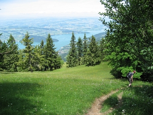 There are many options for the descent, leading to all directions. We chose to go towards Zugerberg until Langmösli (1075müM), from there to Walchwil (449müM). Not far from the top of Gnipen there are some very steep sections where you sometimes even need to climb. The trail to Walchwil is very steep, too, but you don't need your hands anymore.