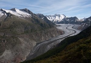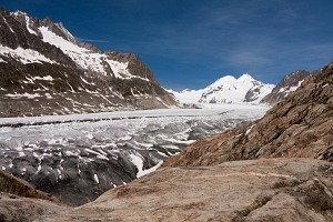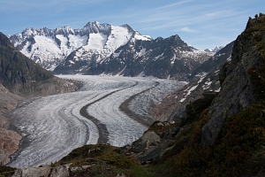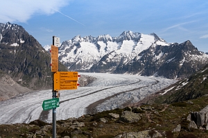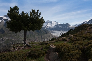 Die erste Etappe geht von der Riederalp hinauf zur Riederfurka, wo sich in der Villa Cassel das Zentrum der Schweizerischen Bundes für Naturschutz befindet. Dort startet einer der schönsten Panoramawanderungen der Schweiz, immer ganz oben auf dem Grat, stetig ansteigend, auf der linken Seite der riesige Aletschgletscher. Jeder von uns hat schon Photos gesehen, die da oben aufgenommen worden sind.