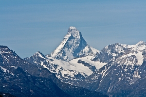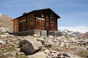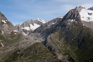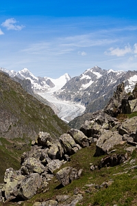 The first section goes from Riederalp up to Riederfurka where there is the center of the Swiss Environmental Organization in the Villa Cassel. That is the place where one of the most beautiful panoramic trails of Switzerland starts, always following the top of the mountains, always climbing at a steady pace. On your left side you can enjoy the view of Aletsch glacier. Anyone of us has seen pictures that were taken along that trail. That time of the year there are still some snow fields along the trail. We had to cross some of them, but that was no problem at all. We hardly met anybody but friends told me that this is very different during high season. The best of it all was that the weather was the best possible. It did not take a long time until we could take off the fleece jackets and walk in t-shirts. | |