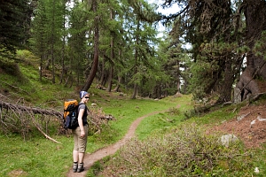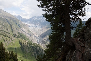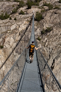 Auf der Riederfurka folgten wir den Wegweisern "Hängebrücke". Der Weg geht durch den Hexenwald-artigen Aletschwald hinunter bis zu ebendieser Hängebrücke (1550m). Unterwegs trifft man auf die Moränen des sich zurückgezogenen Aletschgletschers. Wunderschön ist dort der Grüensee. Steil geht es schliesslich hinunter zur Hängebrücke, über die man die Massaschlucht überqueren kann.