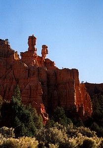 Just at the doors to the famous Bryce Canyon National Park there is the almost unknown Red Canyon State Park (not even mentioned in the Lonely Planet Southwest). Most visitors just pass by looking for the sign showing the way to the bigger brother. We think that this park is definitely worth a stop. You can hike there and enjoy the hoodoos while you're all alone. | |